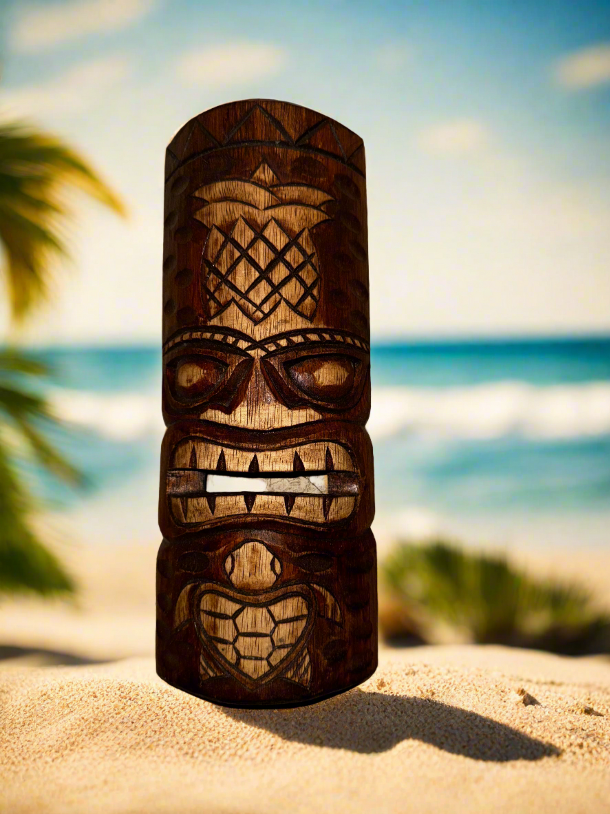 Expertly hand-painted with vibrant colors and intricate details, our 12" Tiki Masks are a stunning addition to any decor. Bring a touch of the tropics to your home or office with this authentic piece. Each mask is uniquely crafted, making it a one-of-a-kind masterpiece.