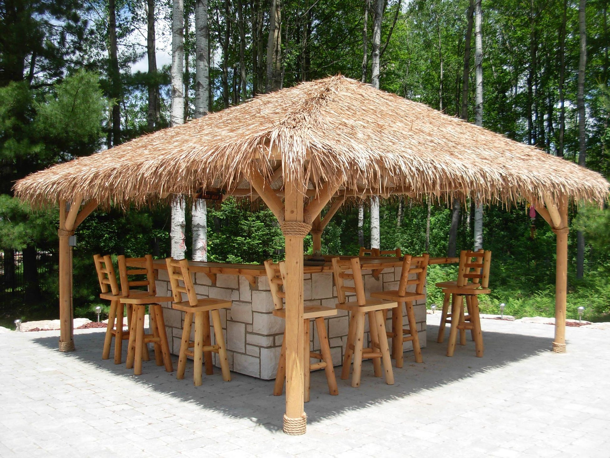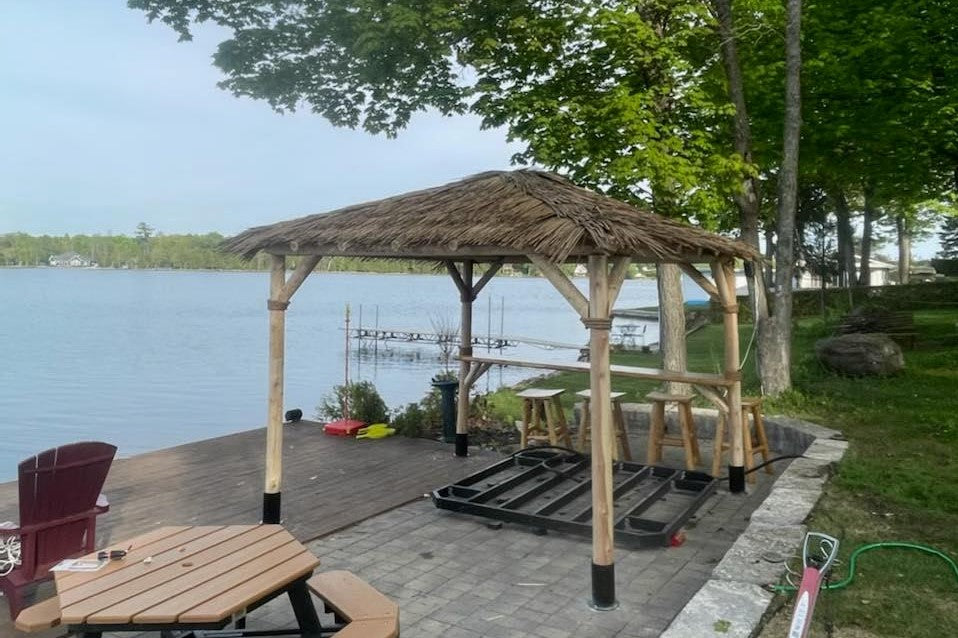 This 12'x 12' square roof kit is the perfect addition to any outdoor space. Constructed with Ontario white cedar logs and rust-resistant hardware, this kit is built to endure the elements. Manila rope accents and your choice of natural or synthetic thatch complete the classic look and ensure lasting durability and style.