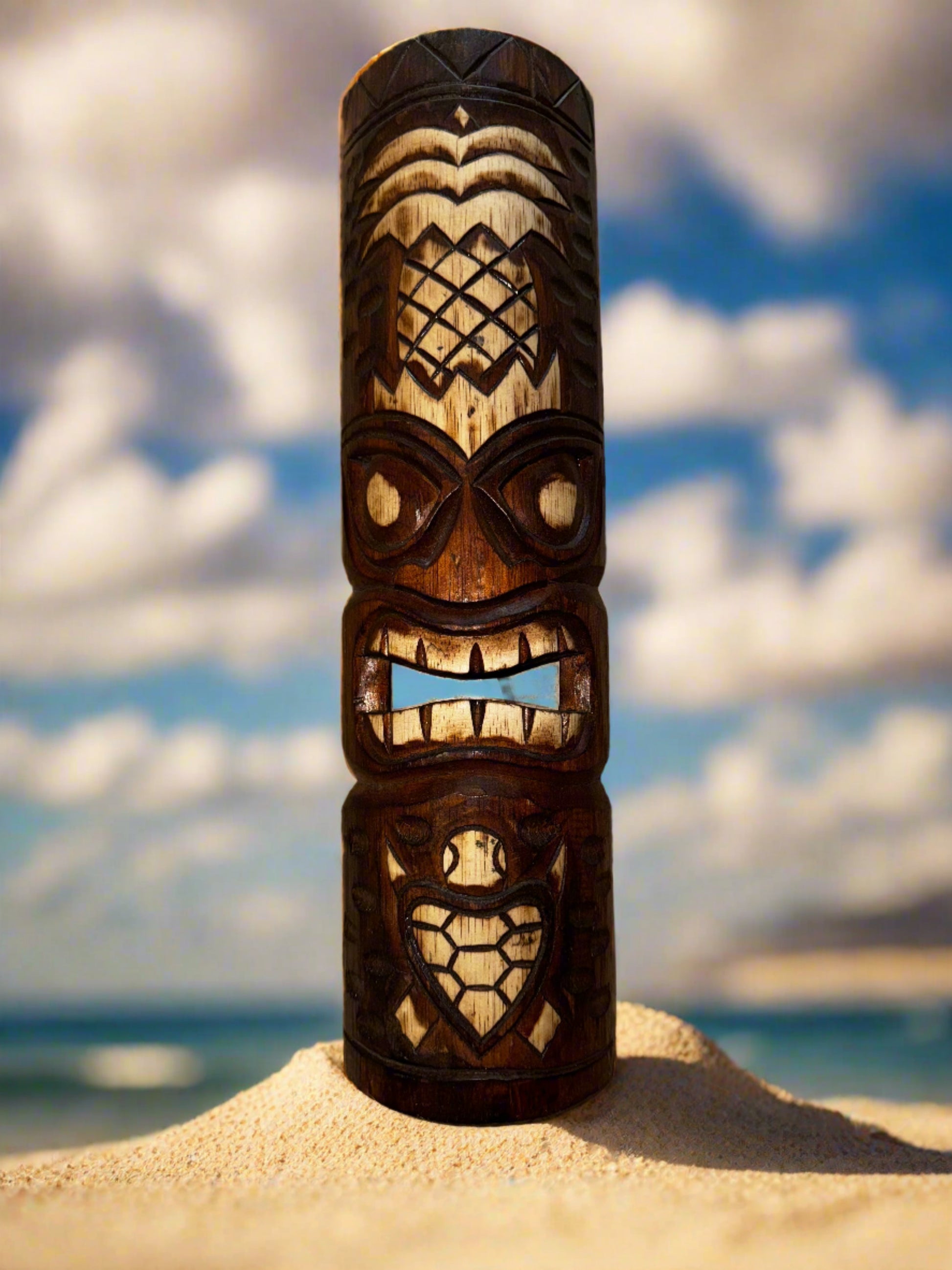 Expertly hand-painted with vibrant colors and intricate details, our 20" Tiki Masks are a stunning addition to any decor. Bring a touch of the tropics to your home or office with this authentic piece. Each mask is uniquely crafted, making it a one-of-a-kind masterpiece.