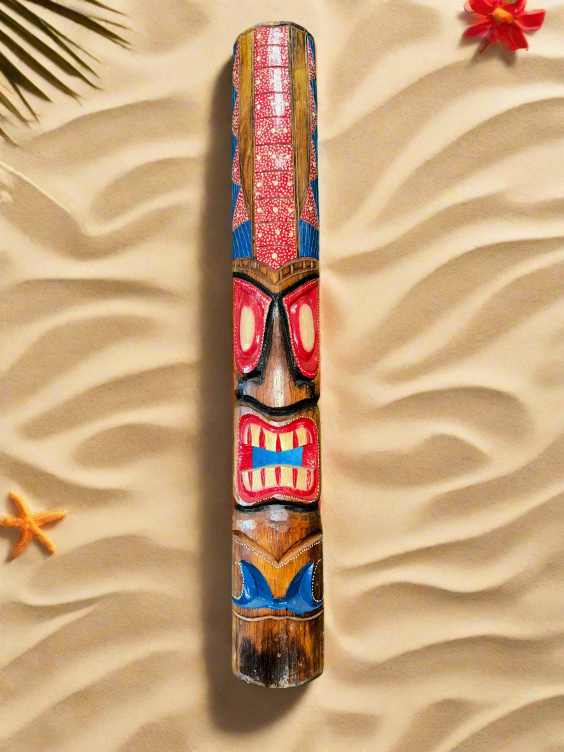 Expertly hand-painted with vibrant colors and intricate details, our 40" Tiki Masks are a stunning addition to any decor. Bring a touch of the tropics to your home or office with this authentic piece. Each mask is uniquely crafted, making it a one-of-a-kind masterpiece.