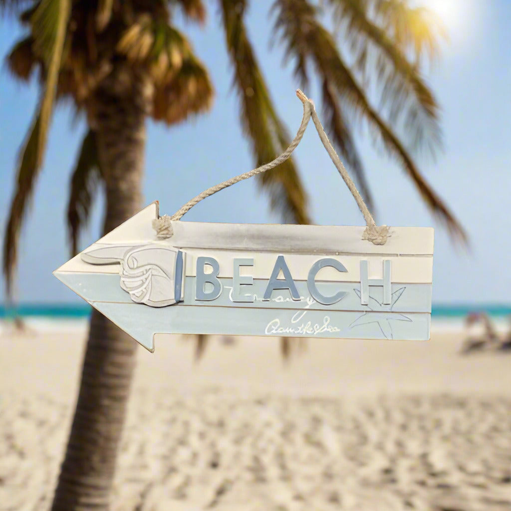 Elevate your home decor with the Beach Arrow. This charming sign adds a touch of seaside flair to any space. Perfect for your home or cottage, this piece will transport you to the beach and bring a cozy, relaxed vibe to your surroundings.