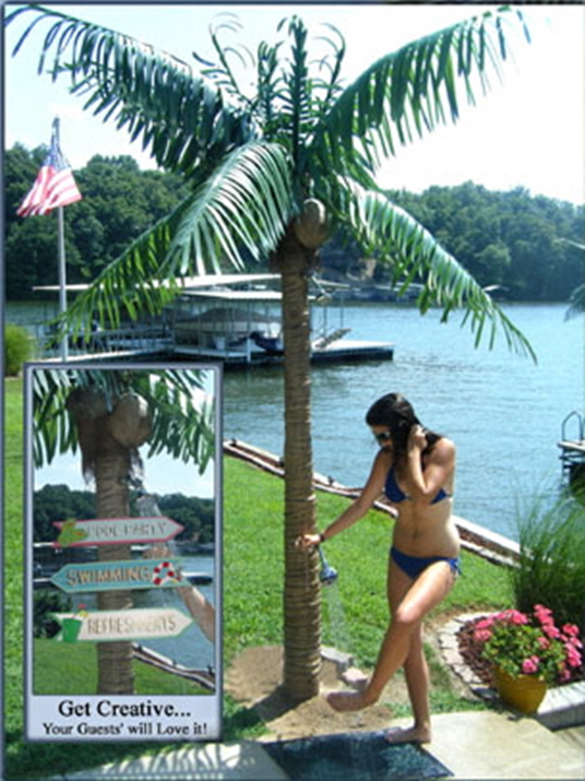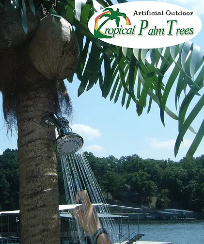 Stay comfortable with the Shower Palm. all plumbing lines and mounting hardware are hidden inside the trunk, while its flexible stainless steel 1/2" tubing connects easily to existing waterlines or even a garden hose, the shower palm is equip with 2 all-weather ADA approved Pull Chain Valves and Shower Heads which each operate independently for a foot rinse or a shower from head to toe. Enjoy the convenience and reliability of the Shower Palm.