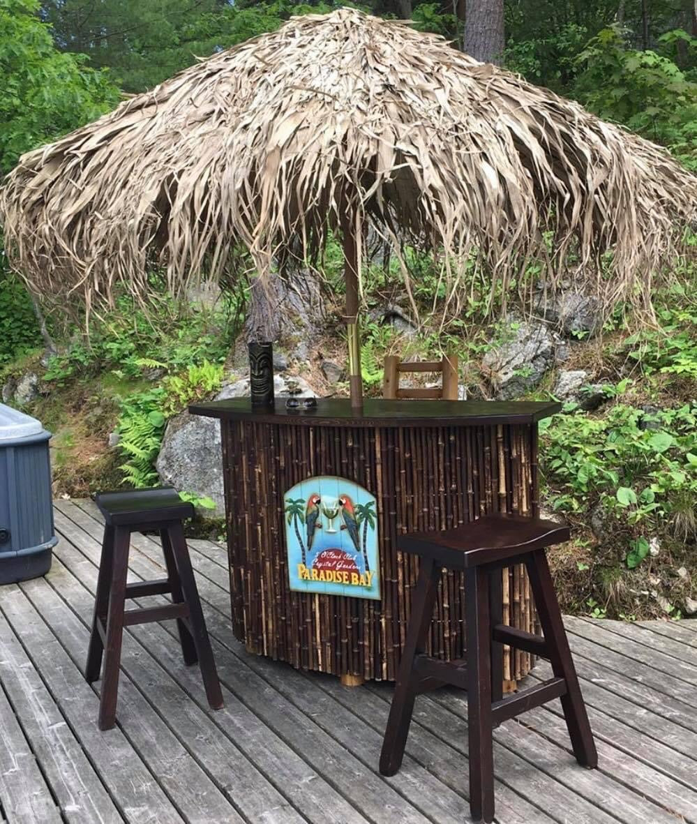 This Umbrella Bar is perfect for creating a tropical atmosphere even in smaller outdoor spaces. The all-Ontario white cedar bar base is cladded with 1" dark brown bamboo paneling and the cedar bar top is stained with a rich brown and coated with 3 layers of marine-grade spar varnish. To close for storage, the 7' natural thatch umbrella simply folds away. The bar base measures 60" wide x 24" deep for easy installation.