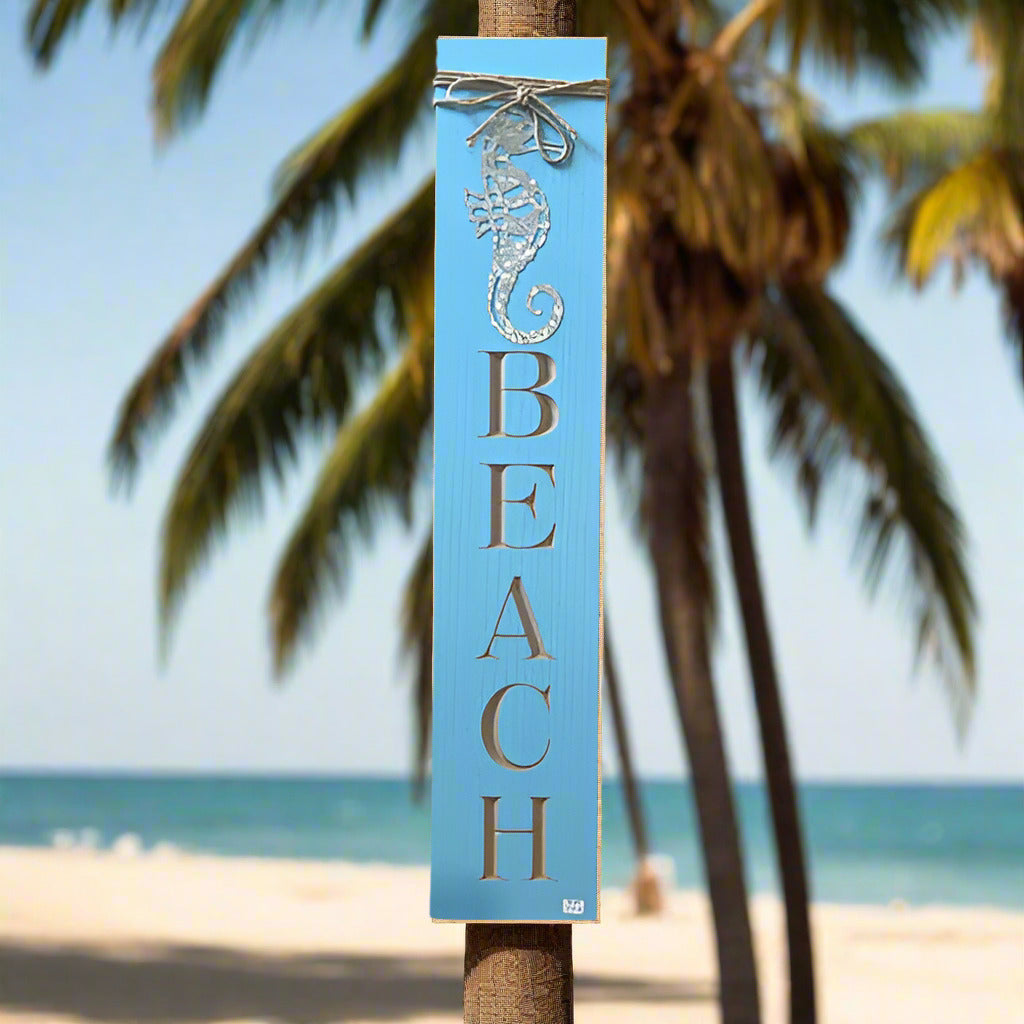 Add some ocean flair to your space with this vertical "BEACH" sign. The blue wood and engraved lettering make a playful statement.